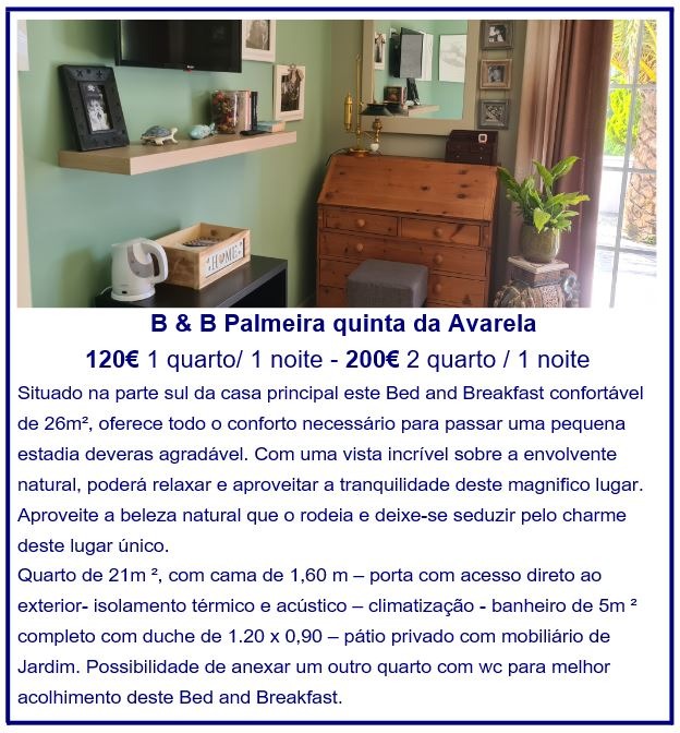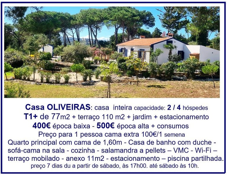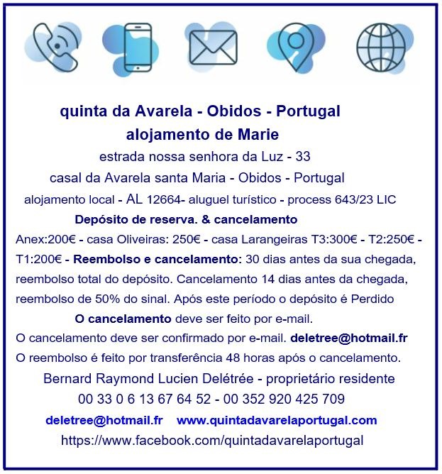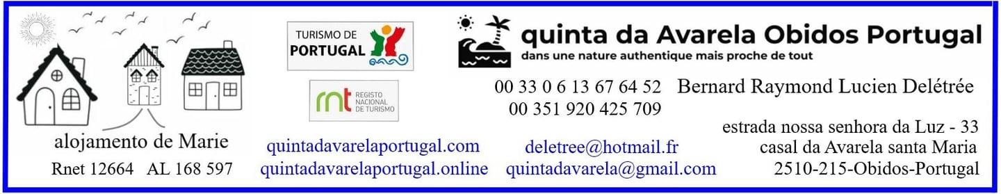 Portugal, região da Costa de Prata, alojamento de Marie na quinta da Avarela a 3km de Óbidos e Caldas da Rainha, próximo do mar, inserida numa autêntica e regeneradora natureza, espaço com tranquilidade, mas também com lojas a menos de 3km na vila medieval de Óbidos e centros comerciais de Caldas da Rainha. O mar ou lagoa a10km, Peniche/Baleal a 20km, Nazaré a 25km, Lisboa a 75km. Diversas casas turísticas e B&B estão disponíveis, habitáveis todo o ano, com normas de acesso a pessoas com mobilidade reduzida (PMR), dispondo de terraço, jardim, estacionamento e de área de piscina arborizada de 400m2 comum aos residentes. Preço durante 7 dias consecutivos ou para o fim de semana de sexta-feira a segunda-feira, o preço é diferente consoante a época alta ou baixa. Ao preço do aluguer acresce os seus consumos - (água, gás, eletricidade)