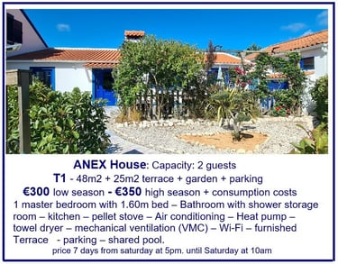 Prices for 7 days, from Saturday to Saturday or for the weekend from Friday to Monday. Prices depending on the high or low season. You should add your consumptions (gas, electricity, water) to the price of your rental.